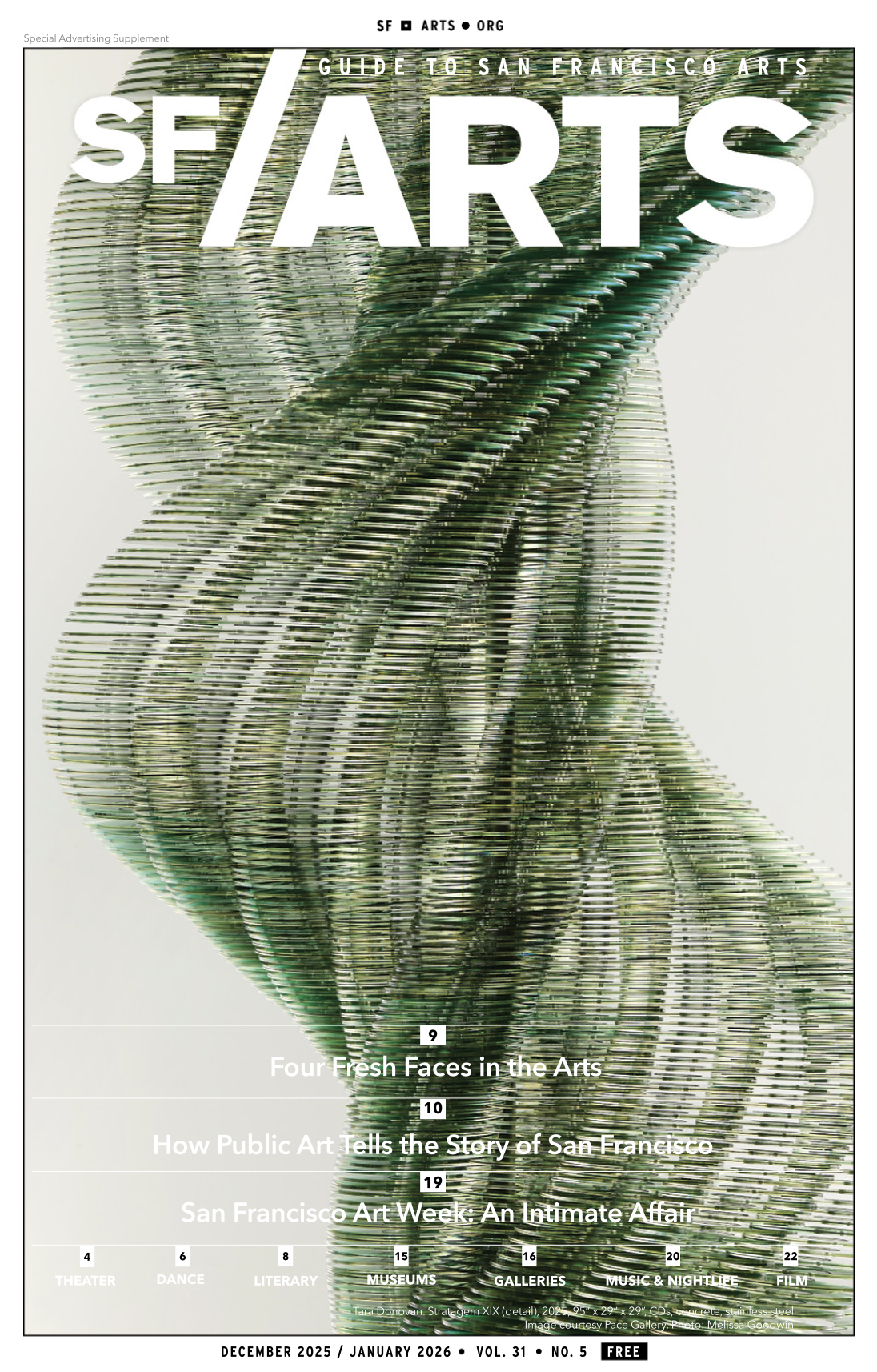 SF/ARTS has a readership of~50,000, is distributed in digital and print, and is an insert in the New York Times Sunday issue in the Bay Area.